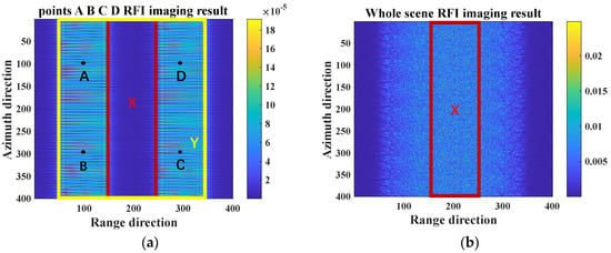 According to Table 2, there are 200 pixels on the ground corresponding to the azimuth beamwidth. Additionally, the length of the interference zone is about 100 pixels. Considering the computing resources, the scene (rectangle ABCD) is set to 200 × 200 pixels. Figure 6a illustrates the imaging results of the four points (A, B, C and D). According to the geometry, the interference zone of other points spread in area Y and only points in the area X have the same RFI power as point O while imaging the whole scene, as shown in Figure 6b. Therefore, the power of area X (red area) is equal to the power of RFI affecting a single resolution cell. The value from (24) and the experiments are shown in Table 6, demonstrating the reliability of RFI power expression.
