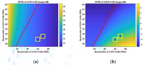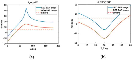 Image SINR, where the integration time of GEO SARs is 220 s and the integration time of LEO SARs is 0.5 s. The azimuth beamwidth of LEO SARs is 1.47°; (a) ; (b) .