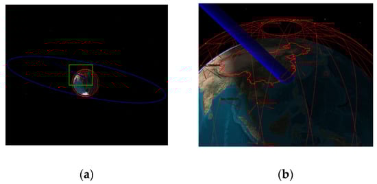 Since specular scattering needs the same incident angle, we suppose that the beam shape of both the GEO SAR and the LEO SAR are circular. Furthermore, we think that GEO SARs have the capability of right look function and LEO SARs have the capability of both the right look function and the left look function. Generally, the number of GEO SARs is much smaller than that of LEO SARs. Therefore, we considered a case involving both a GEO SAR and a LEO SAR constellation. Figure 10 illustrates the geometry of the GEO SAR and the LEO SAR constellation. The orbit elements of the GEO SAR are given in Table 8. The LEO SAR constellation is a Walker Patten constellation for the sun-synchronous orbit. Then, we obtained the position of GEO SARs, LEO SARs, and their boresight using the STK. Finally, according to Table 8, (29) and (30), we evaluated the probability.