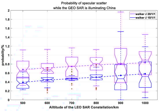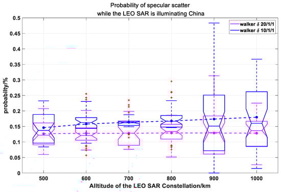 To illustrate how the altitude and the satellite number of the LEO SAR constellation affect the probability of specular scatter, we estimated and in different orbit altitudes (varying from 500 km to 1000 km), different pattens (20/1/1 and 10/1/1), and different true anomaly of the seed satellite. The constellation parameters are detailed in Table 8 and the results are shown in Figure 11 and Figure 12. Every box line draws on the probability of different true anomaly in the same orbit altitude and the same Walker patten, which is shown in Appendix B.