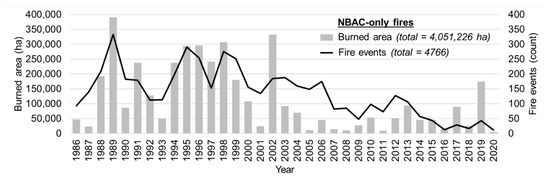 In the NWT, historical estimates of burned area in NBAC were significantly smaller than those originally reported by the agency in CNFDB. The total burned area reported in NBAC for the NWT was nearly 3 Mha less (16%), even though it included the addition of 478,107 ha missing in the historical record in CNFDB (Table 1). This reduction decreased the mean annual burned area from 585,943 ha to 493,109 ha. The largest annual reductions in burned area were for years 1994 (571,074 ha), 2014 (567,728 ha), and 1995 (412,611 ha).