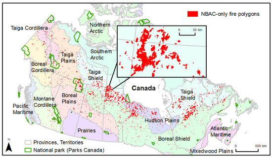 Understanding and quantifying the effects of fire disturbance over longer periods requires consistent, accurate information on the location and size of all burned areas [1,2]. For example, to understand wildfire’s role in maintaining ecosystem function and biodiversity under changing wildfire regimes, one needs to know where landscapes have been either more resilient or more prone to fire [3,4]. In most jurisdictions in Canada, the annual reporting and management of fire activities is entrusted to designated fire management agencies [5]. Fire maps are created by those agencies at the end of each fire season and are compiled into the Canadian National Fire Database (CNFDB), a commonly used source of Geographic Information System (GIS) burned area data in Canada [6]. CNFDB comes in two versions, either as GIS polygons representing fire perimeters or as GIS points representing approximate fire locations and including an estimated burned area. While the burned area estimates for individual fires are more accurate in the polygon version, the point version is necessary because many small fires are only reported as points. However, a considerable proportion of the historical CNFDB polygons consists of broad delineations of the fire which often include unburned patches of forest and waterbodies in the reported area estimate [7]. The completeness of the CNFDB has also been questioned, as some fires in remote locations are occasionally missed by some agencies [8].