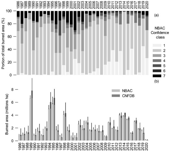 The proportion of NBAC burned area in each year as mapped by the seven confidence classes is shown in Figure 4a, with the resulting annual area burned and 95% confidence intervals (2.5th and the 97.5th percentile of 1000 Monte Carlo simulations) in Figure 4b. Annual area burned and 95% CI derived from the CNFDB are also shown in Figure 4b. Numerical values for the estimated 95% confidence intervals for the NBAC are in Supplementary Information Table S2 (Supplementary Table S3 for the CNFDB). For NBAC, the total width of the confidence intervals (97.5th percentile–2.5th percentile) spanned on average ±158,794 ha or ±9.7% of the annual area burned, varying inter-annually from 43,994 ha (year 2020) to 1,124,734 ha (year 1995). Proportionally to area burned, confidence intervals were narrower when more of the burned area was mapped by confidence classes 1 and 2. More burned area was mapped by confidence classes 1 and 2 from 2004 to 2020 (on average 81.5% of annual burned area, Figure 4a) than from 1986 to 2003 (57.1% of annual burned area, Figure 4a). This is reflected in a narrower confidence interval from 2004 to 2020 (±5.1%) than from 1986 to 2003 (±13.6%), relative to ±9.7% overall. Confidence intervals computed for the CNFDB time series using the same methods were on average 1,140,311 ha or 66% of the annual area burned, ranging from 59,765 ha (year 2020) to 3,069,117 ha (year 1989), or ±32.8% overall, 3.4 times wider than those for NBAC.