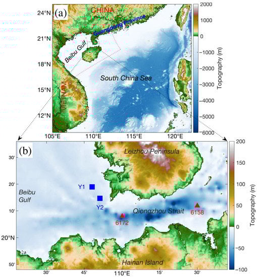 Located in the northwest of the South China Sea, the Qiongzhou Strait (QS) is a busy shipping lane between the Leizhou Peninsula and the Hainan Island (Figure 1). The averaged length, width, and water depth of the strait are 70 km, 30 km, and 44 m, respectively. Compared with two entrances, the bathymetry in the central strait is much deeper, where the depth can reach up to 120 m. As the only direct passage linking the northern South China Sea with the Beibu Gulf, water exchange through the QS plays a key role in modulating the hydrodynamics of either side [13,14,15,16].
