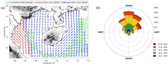 (a) Wind vectors observed by WindSat and ASCAT-A from 30 July to 1 August 2014. (b) The wind rose in the studied area based on the NCEP reanalyzed wind data for June–August 1998–2018. Note: wind direction follows oceanological convention.