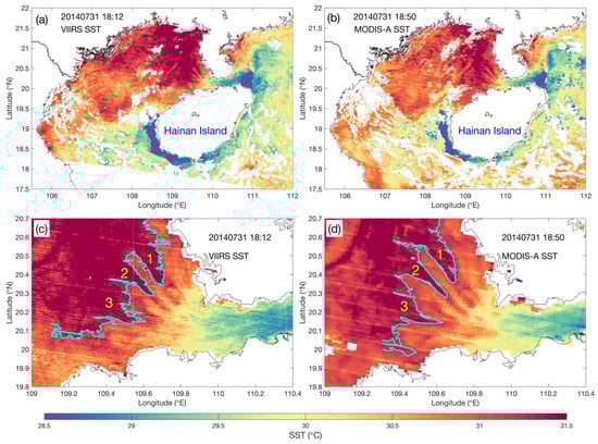 Level-2 SST observations from VIIRS (a) and MODIS-A (b) at 18:12 UTC and 18:50 UTC on 31 July 2014, respectively. (c,d) are magnified views of (a,b) over the western entrance area of QS, respectively. Cyan contours display the isotherms, marking off warm water tongues’ peripheries. Note: “1”, “2”, and “3” are used to mark off three branches of the observed trident-shaped warm water tongue, respectively.
