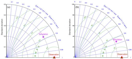 Taylor diagrams for the validation of current magnitude (a) and direction (b). Note: the radial distance from the origin is proportional to the standard deviation of a pattern; the centered root-mean-square difference between the modeled and observed field is proportional to their distance apart (in the same units as the standard deviation); while the correlation between the two fields is given by the azimuthal position of the modeled field.