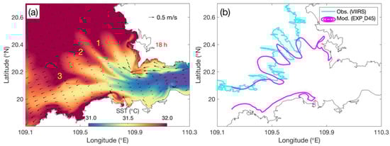 (a) SST field superposed by surface current vectors modeled by EXP_D45. (b) Direct comparison between the EXP_D45 modeled (purple contours) and VIIRS observed (Cyan contours) peripheries of warm water tongues. Note: “1”, “2”, and “3” are used to mark off three branches of the simulated trident-shaped warm water tongue, respectively.