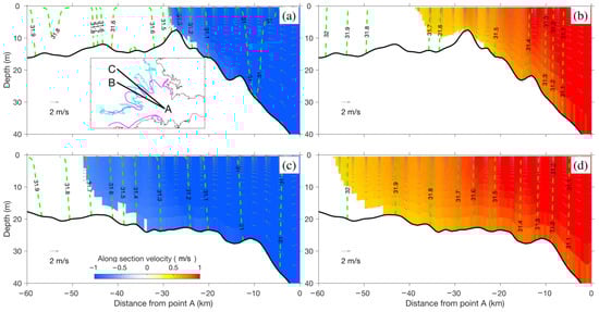 The u velocity field (i.e., along-section velocity component, blue-orange contour), isotherms (green lines), and u-w velocity vectors (i.e., along-section and vertical velocity vectors, gray arrows) along section AB under westward (a) and eastward (b) tidal current. (c,d) The same as (a,b), but for section AC, respectively. Note that westward (eastward) current under 0.7 (0.5) m/s is blanked. Sections AB and AC are shown in embedded axes in (a), data in this figure are based on EXP_D45.