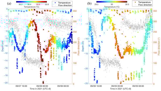 Cruise Observations of water temperature and current direction at stations Y1 (a) and Y2 (b) in the late summer of 2021, respectively.