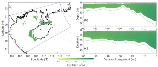 In summer, due to the local intense tidal current, strong tidal-mixing fronts will be established at two entrances of the QS and off the west coast of Hainan Island [50]. Figure 8a shows the depth-mean vertical diffusivity over the northwestern South China Sea. Only diffusivity which is stronger than 1 × 10−1.5 m2/s is mapped, which reveals good consistency with the former investigation. Further, vertical diffusivity along sections AB and AC are presented in Figure 8b,c, respectively, again suggesting a strong mixing background. Thus, in the western entrance area of the QS, strong vertical mixing certainly makes the whole water column well-mixed.