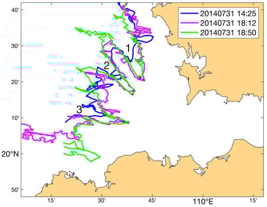 In this part, the spatiotemporal variation of the trident-shaped warm tongue is discussed. The peripheries ( isotherm) of warm water tongue observed by MODIS-T, VIIRS, and MODIS-A on 31 July 14:25, 18:12, and 18:50, 2014 are overlapped together in Figure 9. As time went on, the warm water tongue became sharper and intruded deeper toward the inner QS. During this process, the first (marked with “1”) and second (marked with “2”) branches of the trident-shaped warm tongue significantly moved toward the southeast, while the third one (marked with “3”) generally marched eastward. Based on the time interval between adjacent SST observations and the corresponding change in the location of the warm tongue vertex (black “+” in Figure 9), the moving speed of each branch could be roughly estimated, and detailed results are listed in Table 2. Overall, the trident-shaped warm tongue was propagating at a speed of ~0.7 m/s, with the third branch moving much faster at 0.76 m/s. Due to the small time gap (38 min) between the VIIRS and MODIS-A measurements, the resolution of SST images is insufficient to resolve the propagation of warm tongue and the results are not shown.