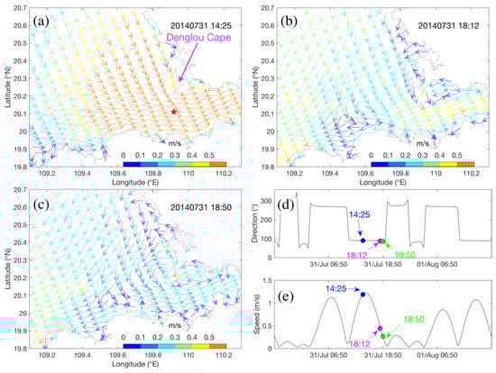 The movement of the warm water tongue is mainly dominated by the current. We obtained the tidal current harmonics by conducting tidal harmonic analysis on the half-hourly 30-day time series of the barotropic tidal currents simulated by EXP_BT. Based on these tidal current harmonics, the tidal current fields accompanying the MODIS-T, VIIRS, and MODIS-A SST observations shown in Figure 9 were efficiently hindcasted and displayed in Figure 10a–c, respectively. Meanwhile, the time series of tidal current direction and magnitude at a representative point (red star in Figure 10a) are shown in Figure 10d,e in turn. During the observing period, eastward tidal current dominated the middle area of the western entrance, but in areas farther north, the tidal current mainly pointed toward the southeast owing to the constraint of the coastline, which well explained different propagating directions of different warm tongue branches (Figure 9). The observing times of VIIRS and MODIS-A were located near the end of the eastward tidal current phase, when the current is weak (~0.3 m/s). Coupled with the short time interval, it is easy to understand why peripheries of the warm tongue mapped by VIIRS and MODIS-A almost overlapped with each other. In addition, Figure 10a–c reveals that the tidal current phase in the seas adjacent to the Denglou Cape (Figure 10a) is in advance of that in the other area, thereby taking the lead in pushing warm water back to the gulf, and this answers why the first branch of the trident-shaped warm tongue moved slightly westward while the other two still marched toward east during 18:12 to 18:50 31 July 2014 (Figure 9).