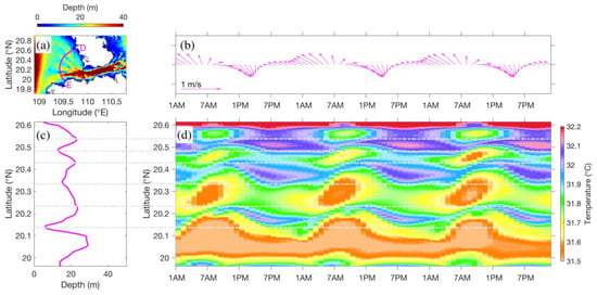 (a) Curved section DE (purple line) superposed on the water depth. (b) Time series of section-averaged current vectors. (c) Water depth along section DE. (d) SST time series along section DE.