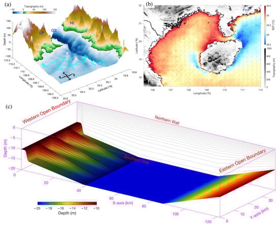 (a) Three-dimensional view of the topography over the western entrance area of the QS. Cyan contours are the same as that in Figure 3c (isotherm). (b) Climatological summer SST and wind around Hainan Island, the SST is derived from MODIS monthly-mean SST data and averaged over June–August 2000–2014, the wind is based on the ERA-Interim 3 h wind product and averaged over June–August 1979–2014. (c) The grid design of the idealized numerical experiments.