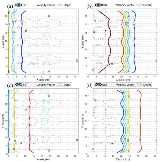 After the model achieved a quasi-steady state, SST distribution together with current vectors and water depth at the end of the westward and eastward current simulated by EXP_ID1 are shown in Figure 13a,b, respectively. Regardless of the current direction, a faster current always flows over deep-sea troughs rather than shallow sea ridges, which is due to the stronger bottom friction over shallower ridges. As a result, the eastward current carries the western warm water toward the east with faster propagation over sea troughs, and thereby the alternatively warm–cold thermal pattern develops (Figure 13b). Under the westward current, a similar situation still occurred, but with colder water traveling farther west over deep troughs. In Figure 6, sections AB and AC cross two adjacent sea ridges and sea trough, respectively. By blanking westward (eastward) current under 0.7 (0.5) m/s, it is clear that the current along section AC is always stronger than that along section AB, which may be one of the reasons for the further eastward intrusion of warm water along section AC (Figure 6a). Note that thermal exchange at the western entrance of the QS is not only regulated by a topography-modulated current, which will be discussed later.
