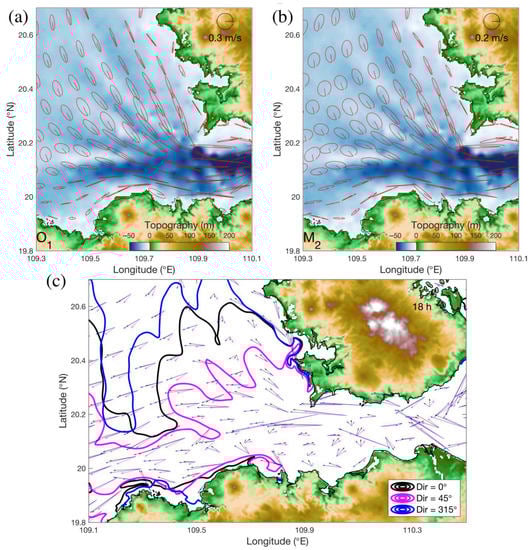 Distribution of diurnal (a) and semi-diurnal (b) surface tidal current ellipses in the studied region. The O1 and M2 tidal current constituents are selected as representatives of diurnal and semi-diurnal components, respectively. (c) Comparisons of SST distribution (31.45 °C isotherm) and surface current vectors modeled by EXP_D45 (in purple), EXP_D0 (in black), and EXP_D315 (in blue).
