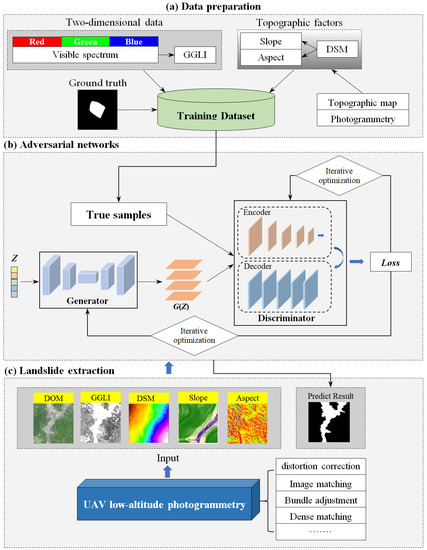 Workflow of the proposed method. (a) Data preparation; (b) Adversarial networks including generator and discriminator; (c) Landslide extraction from UAV-photogrammetry-derived data.