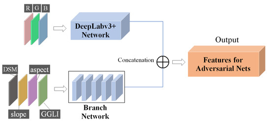 Ideally, if a deep network is reasonable and fully trained, then vegetation information hidden in an RGB (i.e., red, green, and blue) image may be learned directly; similarly, slope and aspect hidden in the DSM or DEM may be derived. However, the following calculation formula of GGLI [35], slope, and aspect shows that it needs nonlinear implicit learning. To accelerate the convergence of the proposed network, multisource data, including spectral (RGB bands and GGLI) and topographic (DSM or DEM, slope, and aspect) information, were explicitly used in this study to feed into the proposed adversarial nets.