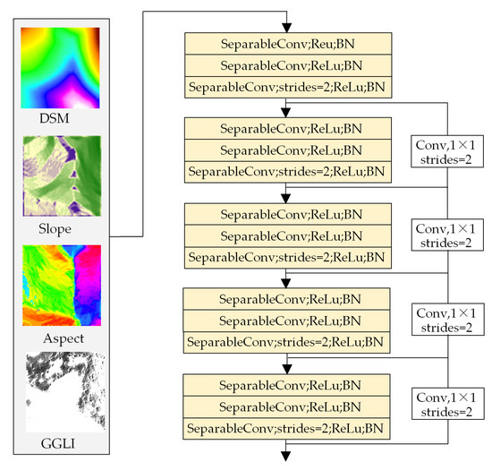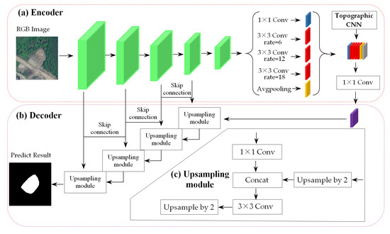 In this study, multilevel skip connection architecture with an upsampling operation was designed to retain the boundary information at all levels as much as possible to address the aforementioned problem of DeepLabv3+ for landslide extraction. The architecture of improved DeepLabv3+ is given in Figure 3. Similar to DeepLabv3+, the improved model consisted of an encoder (Figure 3a) and decoder (Figure 3b), and the convolutional operation for landslide feature extraction for RGB images was consistent with DeepLabv3+. Unlike original DeepLabV3+, an architecture of topographic feature extraction, namely the topographic CNN shown in Figure 4, was inserted into the encoder to concatenate topographic features together with spectral features. Subsequently, low- and high-level features were concatenated through the upsampling module shown in Figure 3c to effectively obtain the contextual information, and it helped to transmit the detailed landslide features from lower to higher layers. Therefore, the spatial information of the landslide weakened by the pooling operation could be better restored, and the clear boundary contour of the landslide may have been delineated after the decoding operation in the final prediction.