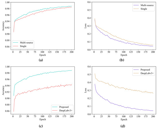 Comparisons of the training results. (a,b) are the comparative training results of single data and multisource data for the proposed network, and (c,d) are the comparative training results of the original DeepLabv3+ and the proposed network.