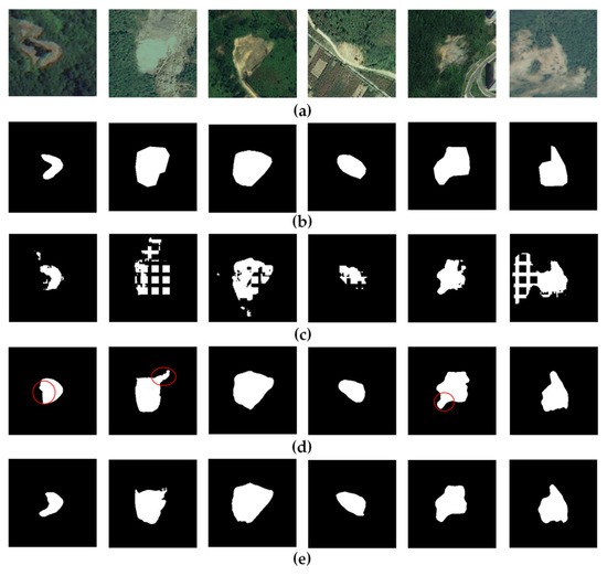 Examples of landslide extraction using DeepLabv3+ and the proposed network. White color denotes the region of landslide, and black color denotes the image background. (a) is the RGB images, and (b) is the ground-truth landslide boundaries corresponding to (a). (c–e) are the experimental results obtained using DeepLabv3+, the proposed network with single and multisource data, respectively. Red circle is used to highlight the comparative region.