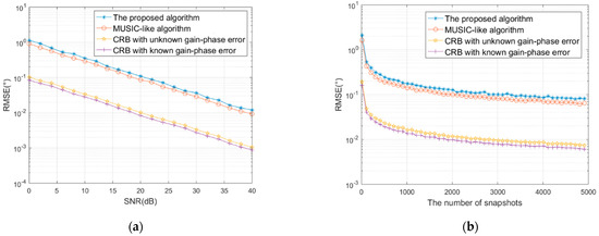 Using the same settings with Section 5.1, the proposed algorithm is assessed and compared with the MUSIC-like algorithm in [20] under different SNRs and different snapshots. Given L = 256, Figure 3a shows the 2D DOA estimation RMSEs of the proposed algorithm and the MUSIC-like algorithm with the SNR changing from 0 dB to 40 dB in a step of 2 dB. Given SNR = 10 dB, Figure 3b gives the 2D DOA estimation RMSEs of the proposed algorithm and the MUSIC-like algorithm with the snapshot number changing from 10 to 5000 in a step of 100. Both Figure 3a,b are obtained by averaging over 500 Monte Carlo trials. The theoretical CRB curves with unknown and known gain-phase error coefficients are also shown in Figure 3a,b.