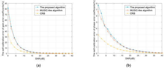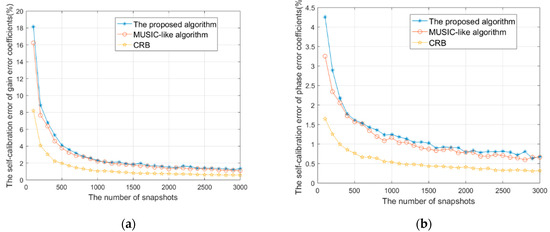 Given L = 256, Figure 4a,b show the self-calibration errors of the gain-phase error coefficients obtained by the proposed algorithm and the MUSIC-like algorithm with the SNR changing from 0 dB to 40 dB in a step of 2 dB. Given SNR = 10 dB, Figure 5a,b show the self-calibration errors of the gain-phase error coefficients obtained by the proposed algorithm and the MUSIC-like algorithm with the snapshot number changing from 10 to 5000 in a step of 100. The theoretical CRBs of the gain-phase error coefficient estimations are also shown in Figure 4 and Figure 5.