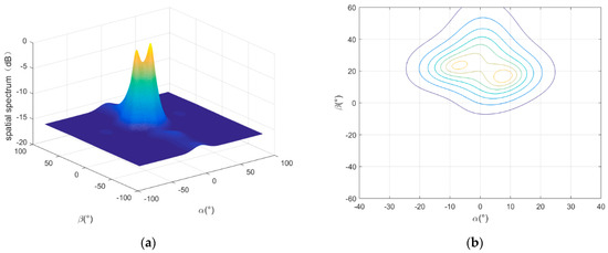 2D MUSIC estimation results with self-calibration. (a) Spatial spectrum; (b) Contour map.