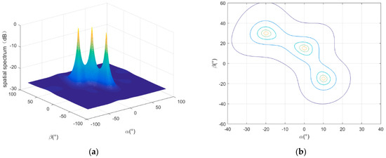 It should be pointed out that the eigenvalue decomposition of can be avoided by Equation (25), thus reducing the computational complexity of the proposed algorithm. At the same time, the automatic pairing of the estimated 2D DOAs can be realized by Equations (24) and (26). □