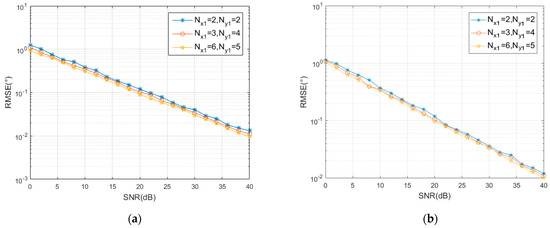 It can be seen that, with the increase of the number of auxiliary array elements, the 2D DOA estimation performance of the proposed algorithm will be slightly improved regardless of the source number and angular position, while the improvement is negligible compared to the cost of the additional auxiliary array elements. Hence, for practical URAs with gain-phase errors, the proposed algorithm only needs and auxiliary array elements for 2D DOA estimation.