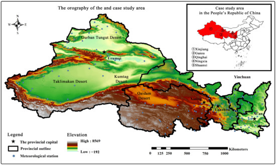 This study took Northwest China as the study area, including Shaanxi, Gansu, Qinghai, Ningxia, and Xinjiang, which accounts for nearly one-third of China’s total land area (Figure 1). It is located inland and close to the source of the winter monsoon, and most areas of this region experience a moderately temperate and warm temperate continental climate, whereas a very small proportion of the region experiences an alpine climate. Due to the arid climate, the total annual precipitation in the region is low, with most areas having a total annual precipitation of less than 400 mm, with a decreasing trend from east to west. Droughts and winds are prominent features of the natural environment in this area [25,30]. The wind speed in this region is higher in the south and lower in the north, and the annual average wind speed in most regions is 1–4 m/s. Most of the area is under the control of westerly winds. The average annual relative humidity in much of the northwest region is below 50%. The relative humidity of Qaidam Basin is only 30%, which is the driest place in China. This region exhibits large differences in diurnal and annual temperature. The terrain of Northwest China consists mainly of a plateau and basin with widespread deserts, and the elevation in the region varies greatly. These topographic areas all belong to the second ladder of China’s topography. In terms of altitude, the Weihe Plain of Guanzhong in Shaanxi province is about 400 to 600 m above sea level, the average altitude of the Loess Plateau is about 1000 m, and the Qaidam Basin of Qinghai Province is between 2600 and 3000 m above sea level. Due to the natural geographical environment in the study area, desertified land and deserts are densely distributed in this region of China. In terms of soil and vegetation structure, the distribution of vegetation in the horizontal direction has a clear regional variation in longitude, from east to west, from grassland to desert steppe to desert. The soil in this region is dominated by desert soil, namely black lime soil. The natural geographical characteristics of the study area make it the most concentrated area of desertified land and desert in China. There are four major deserts in Northwest China, namely the Gurban Tungut Desert, Taklimakan Desert, Kumtag Desert, and Qaidam Desert.