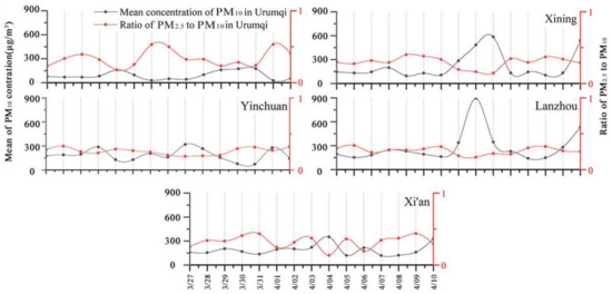 - Atmospheric particulate matter data revealed that the PM10 concentrations during this sandstorm event exceeded 400 µg/m3. The PM2.5/PM10 ratios in all major cities in Northwest China were lower than 0.6 during the sandstorm events, indicating that the proportion of fine particles in atmospheric particulate matter was small, which was due to the increase in inhalable particulate matter content in the atmosphere caused by natural pollution sources. Therefore, it could be inferred that this sandstorm event had a great impact on the PM10 index of those cities. This conclusion means that the occurrence of dust events leads to the occurrence of extreme values of PM10.