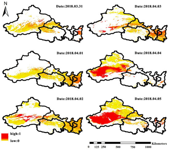 As seen from the AOD data, the spatial distribution of the atmospheric aerosol optical depth in Northwest China changed significantly and showed regional variation over time during the sandstorm event in 2018 (Figure 3). AOD data obtained during the sandstorm event in 2018 showed that the spatial distribution of the AOD index in Northwest China changed obviously. Areas with high AOD values were distributed in small parts of Gansu, Ningxia, Shaanxi, and the central part of the Southern Xinjiang Basin on 30 March, and this was consistent with the distribution of PM10 concentrations. This was because the possibility of other events causing the high value cannot be excluded. From 2 April onwards, some areas of the southern Xinjiang Basin began to exhibit extremely high AOD values. During the next few days, the area of influence of this event continued to expand until most areas of southern Xinjiang Basin were affected. The AOD values in other parts of the study area were lower than those in the southern Xinjiang Basin.