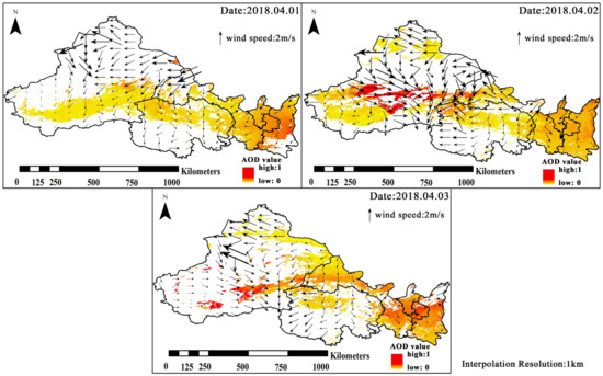This study explored the change in the wind speed and direction with AOD, as Parajuli et al. [42] found that wind speed had a good correlation with AOD and the relationship between wind and dust presented a non-linear correlation. Figure 4 shows the distribution of wind speed and wind direction during the sandstorm event. According to the study of Huang et al. [43], for the daily average wind speed near the surface, the cubic spline function interpolation can achieve better interpolation accuracy. Therefore, the main wind speed and wind direction data are reproduced on the map during the sandstorm event based on this method. The size of the arrows in the figure indicates the magnitude of the wind speed, and the direction of the arrows indicates the wind direction. The direction of dust aerosol propagation was highly consistent with the wind direction. Figure 4 shows that the surface wind speed was mostly easterly at the junction of Xinjiang-Gansu-Qinghai, which was not conducive to the transport of dust aerosol downstream from the deserts. It is known that the wind direction at different altitude levels in Taklamakan Desert and surrounding areas is different; as a result, the near-surface level is not conducive to the eastward transport of dust [44]. In this study, the data of wind speed and direction were taken mainly from near-surface meteorological stations. Only when its rises to more than 3 km can dust be transported to downstream under the action of the westerly wind. This may be the cause for the different simulation results of wind direction and airflow reverse trajectory near the surface. The sandstorm event mainly occurred during the period of 1–3 April, and affected all of Northwest China on 2 April and 3 April. This indicates that the atmospheric concentration of dust aerosol was higher, the transmission speed was greater, and the influence range was wider.