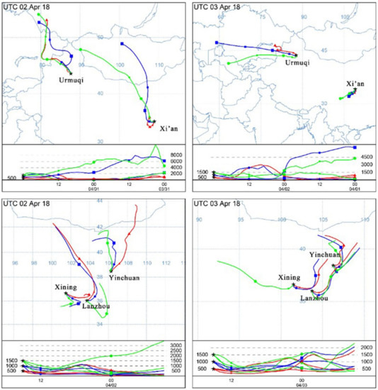 Simulation of dust backward trajectories in different cities of Northwest China for the period relevant to the sandstorm event in April 2018, for the case study area.