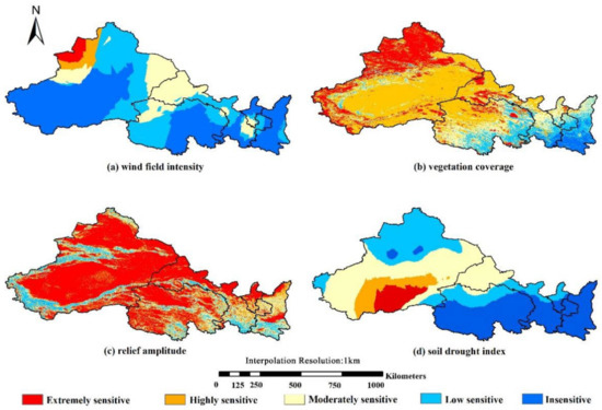 Wind erosion generates large quantities of mineral particles, such as dust and aerosols, within desert areas, which are then released into the atmosphere [46]. Due to large-scale wind transportation, the significant contribution of particulate matter to air pollution may be caused by aerosol sources over long distances [47]. Therefore, sensitivity analysis of regional wind erosion combined with analysis of dust aerosols helps provide a comprehensive understanding of conditions in the study area. In this study, the wind field intensity, vegetation coverage, relief amplitude, and soil drought index in the region based on data from the whole year of 2018 were evaluated, and the sensitivity to regional wind erosion was estimated by combining the results of these analyses. Table 1 showed the criteria for the sensitivity scale for dividing the sensitivity indicators of each factor. According to these criteria, we mapped the sensitivity of the four factors respectively (Figure 8).