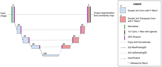 Using dropout in this way is preferable as it reduces computation whilst preventing overfitting during training [54]. MCD is explained further in [52,54,55]. We use 500 different dropout models times to sample a wide range of models from the distribution. The dropout rate for all the models was 0.25.