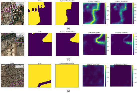 In [7], the spatial (extensional) uncertainties in slum boundaries delineated by urban scientists on VHR maps were considered. Substantial variations in the predictions made were found among these human experts particularly at the boundaries of settlements, highlighting the importance of objectively quantifying the uncertainty of models for this task. With a traditional non-machine learning Object-Based Image Analysis (OBIA) approach and a focus on Jakarta, Indonesia, ref. [35] interviewed local experts to produce lists of common characteristics of slums in the area. These were converted into rule sets for different OBIA models. The level of agreement between the models was calculated as an integer confidence score out of five and used as a proxy for certainty, rather than a precise uncertainty value like can be obtained by modern computer vision models [36].