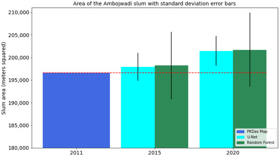 The growth of Ambojwadi is shown in Figure 8 (with more buildings appearing as shown in the circled regions) and the detected area change with time for our Random Forest baseline model and our Monte Carlo Dropout U-Net model is shown in Figure 9. Note that the y-axis starts at 180,000 m squared. The total uncertainty in model predictions is represented by the black standard deviation error bars. The 2011 area has been calculated from the ground truth labelling when the region was surveyed. The red dotted line shows the 2011 slum area for reference. We can see in Figure 9 that both the U-Net and Random Forest models show similar predictions for the growth of the Ambojwadi slum between 2011 to 2020. The error bars representing the predictive uncertainty (in the form of the standard deviations of the predicted areas by the population of 500 sampled MCD models and Random Forest of 500 trees, respectively) show that between 2011 and 2015 both models detect a small amount of growth but not at a level where we can be confident—the error bars for both models overlap with the red dotted line which shows the 2011 area. Hence we cannot conclude with confidence that either model has detected genuine change in the slum area between 2011 and 2015. But in 2020, Figure 9 shows that both of the models show predicted areas noticeably higher than in 2011 but the Random Forest model still has an error bar overlap with the 2011 area. However, the U-Net model shows no overlap in the error bar for its 2020 prediction with the 2011 area, representing a confident detection of the increase in the Ambojwadi slum area by 2020.