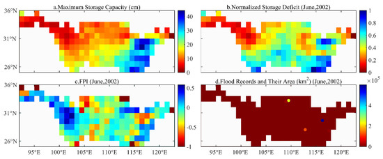 Examples involved in calculating the FPI in the YRB during April 2002–December 2019. ((a–d) are the MSC (cm), normalized storage deficit in June 2002, FPI in June 2002, and flood records and their area (km2) in June 2002, respectively).