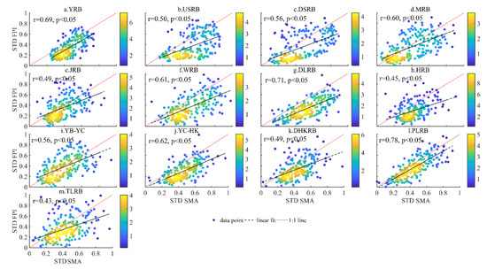 The relationship between the VIC-SMA and GRACE-TWSA in the YRB and its sub-basins was analyzed from April 2002 to December 2019 (Figure 10). SMA and TWSA in all sub-basins showed a significant positive correlation (p < 0.05), including the original time series and detrended time series. For the original time series, the correlation coefficient of SMA and TWSA in the downstream of Jinshajiang-Shigu was the highest, reaching 0.89 (Figure 10c) and the lowest, 0.25, in the Wujiang River Basin (Figure 10f); however, Figure 11 shows the relationship between SMA and FPI in the YRB; the strongest correlation was found in the Poyang Lake Rive basin, which reached 0.78, as shown in Figure 11l); the poorest correlation was explored in the Taihu Lake River Basin, which was approximately 0.45 (Figure 11m). Therefore, due to the close correlation between the TWSA and SMA, the change in SM can lead to significant changes in the TWSA and FPI.