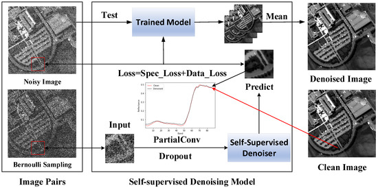 A different Bernoulli sampling results from different noise data and for a series of noise hyperspectral image pairs (, ). Such image pairs are needed for self-supervised training; that is, the model takes as the input data, and the model recovers based on and obtains the model output .