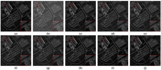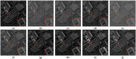 Case 12—Denoising results of different algorithms in band 7: (a) clean band; (b) noisy band; (c) BM4D; (d) LRMR; (e) HyRes; (f) L1HyMixDe; (g) DHP-2D; (h) SIP; (i) SURE-CNN; and (j) 3S-HSID.