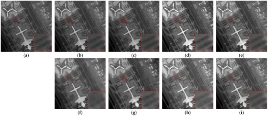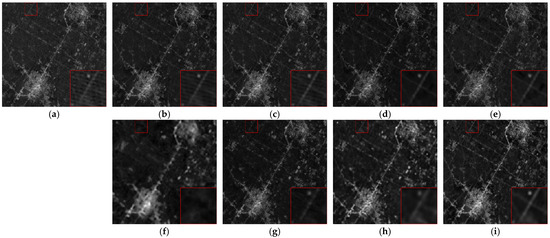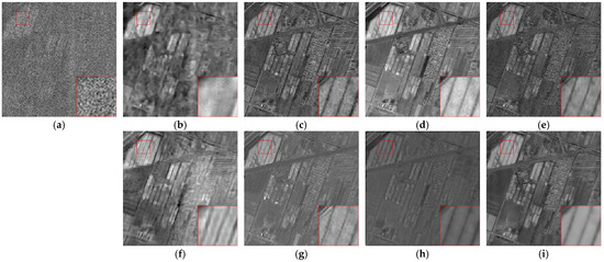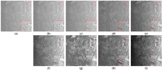 PRISMA hyperspectral image denoising results with band 66: (a) real image; (b) BM4D; (c) LRMR; (d) HyRes; (e) L1HyMixDe; (f) DHP-2D; (g) SIP; (h) SURE-CNN; and (i) 3S-HSID.