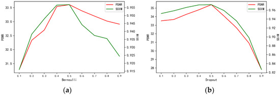 In this experiment, the Bernoulli sampling probability b and dropout probability p are some of the most important hyperparameters. We used Case11 simulation data to test the selection of these two probability values. In the experiment, the dropout probability was , and the Bernoulli sampling probability was , with an interval of 0.1. In the form of cross-validation, the dropout probability and Bernoulli sampling probability were added to the experiment. After the experiment was completed, the PSNR values of all denoising results were calculated. To find the optimal combination, we fixed a certain probability value and calculated the average PSNR value of all denoising results in the range of under the current probability value, as shown in Figure 19. From the experimental results, it can be seen that 3S-HSID demonstrated the best denoising performance when and .