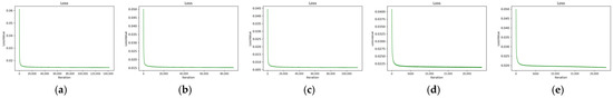 Relationship between loss value and the number of iterations for: (a) Case 11, iterations = 142,000; (b) Case 12, iterations = 89,000; (c) Case 2, iterations = 114,000; (d) Case 3, iterations = 24,000; and (e) Case 4, iterations = 23,000.