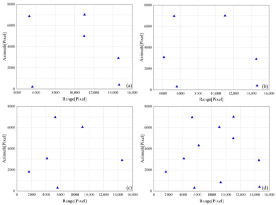 Four GCP layout schemes considered herein: (a) denotes the distribution of the 6 points along the azimuth direction, (b) denotes the distribution of the 6 points along the range direction (c) and (d) denote the distribution of 6 and 11 points along the random direction, respectively. Where the blue triangles represent the GCPs.