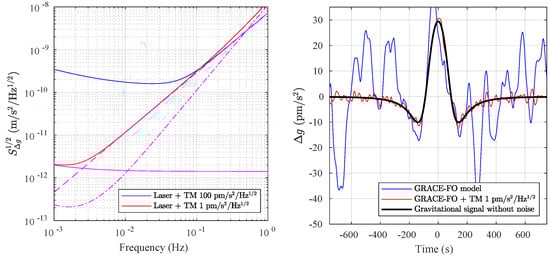 (Left) Differential acceleration sensitivity of a two SC geodesy measurement, considering simplified models for GRACE-FO laser frequency and TM acceleration noise (blue) and, in red, the expected performance with GRACE-FO interferometry coupled with the improved GRS TM system studied here, including noise in the GRS TM acceleration and readout. Contributions of TM stray accelerations (solid), laser frequency noise (dashed), and the local TM readout (dash-dot) are shown in magenta. Some drag-compensation is assumed both in order to achieve the acceleration noise requirement and to limit stiffness coupling to GRS readout noise, both relevant only near the 1 mHz lower frequency limit (this includes applied TM forces in the pm/s range, with associated stiffness /s). (Right) Simplified simulated differential acceleration signal and noise from a “mascon” with a 1 mm layer of water spread over a 400 km diameter circle in the two configurations (for visualization a 4th order low pass filter with 15 mHz corner frequency is applied to signal and noise in both cases).