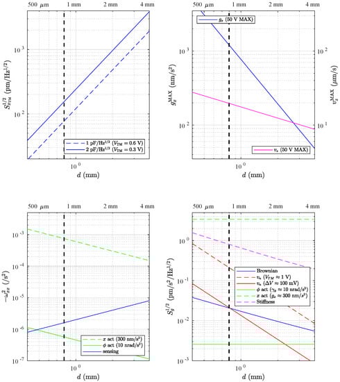 The capacitance sensitivity scales with electrode surface—proportional to —divided by the gap squared, . For a 34 mm cube and the 1 aF/Hz noise demonstrated in LPF at TM AC bias V, the required 200 pm/Hz is reached for gaps below roughly 1.25 mm (see upper left of Figure 3). At m, the needed position sensing is achieved, with some margin (140 pm/Hz) with half the TM 100 kHz bias (0.3 V amplitude) and, thus, relaxed capacitive noise requirements (2 aF/Hz).